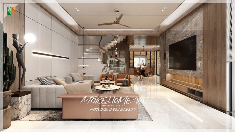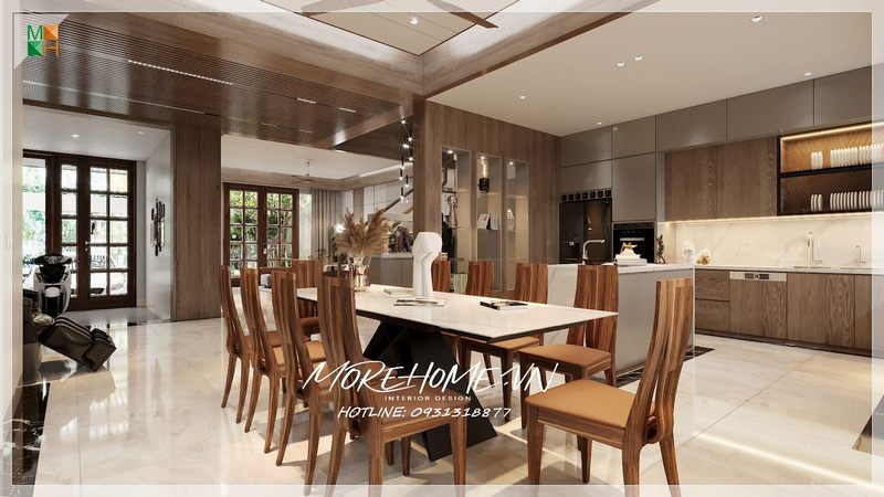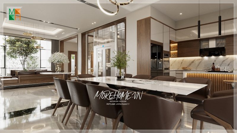 Khu vực phòng ăn được thiết kế theo phong cách hiện đại, giúp tạo ra một không gian thoải mái, ấm cúng và gần gũi cho tất cả thành viên trong gia đình.